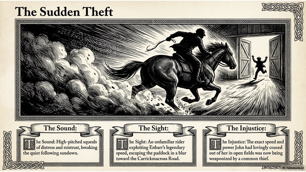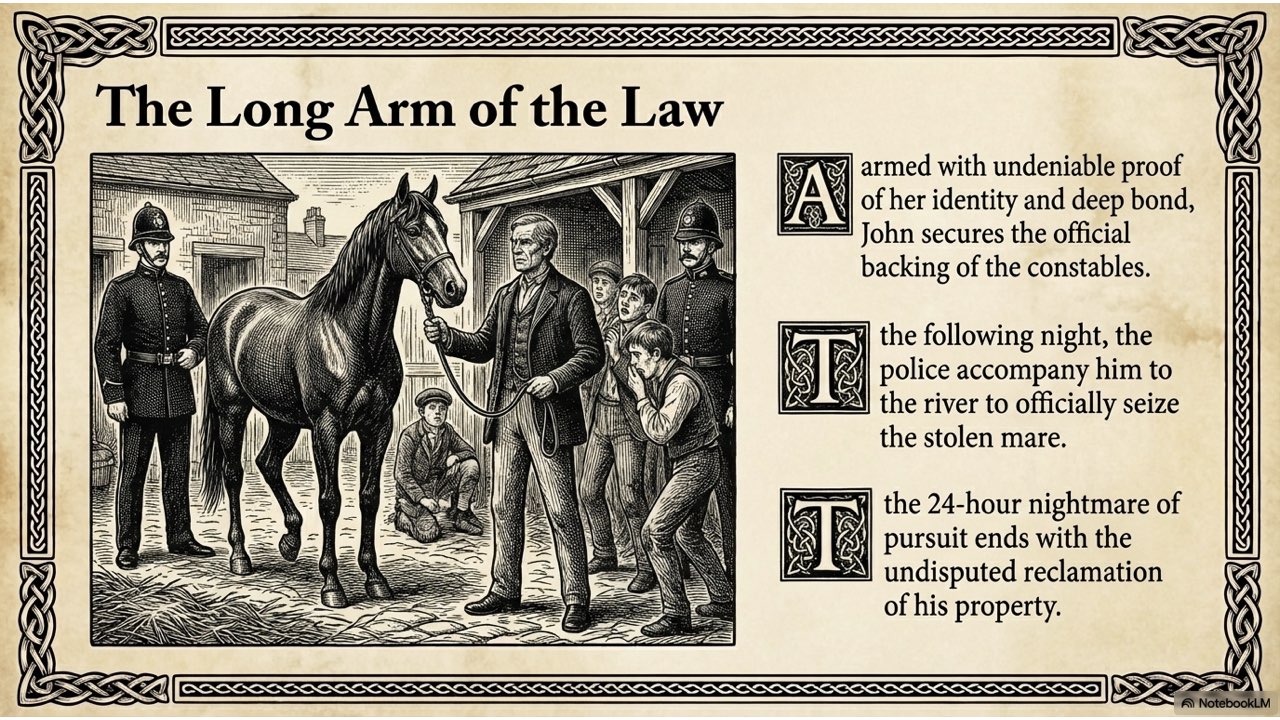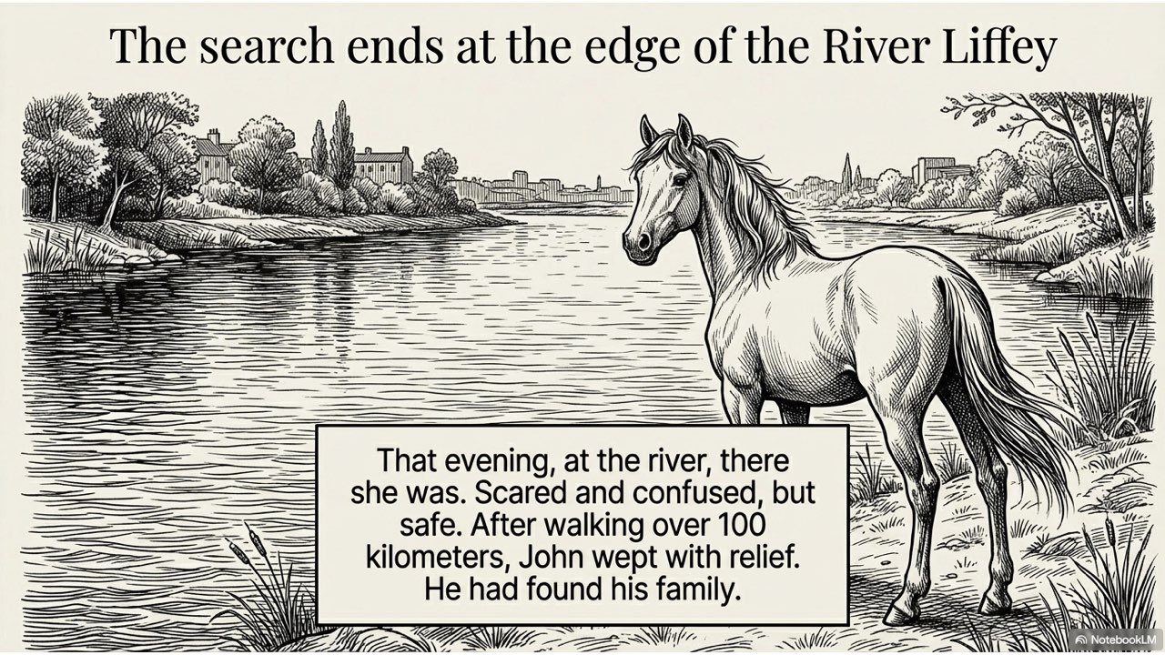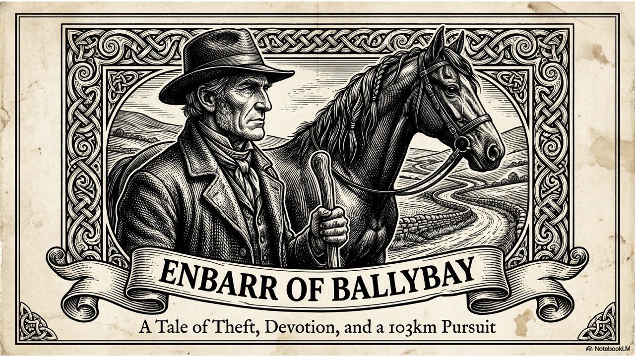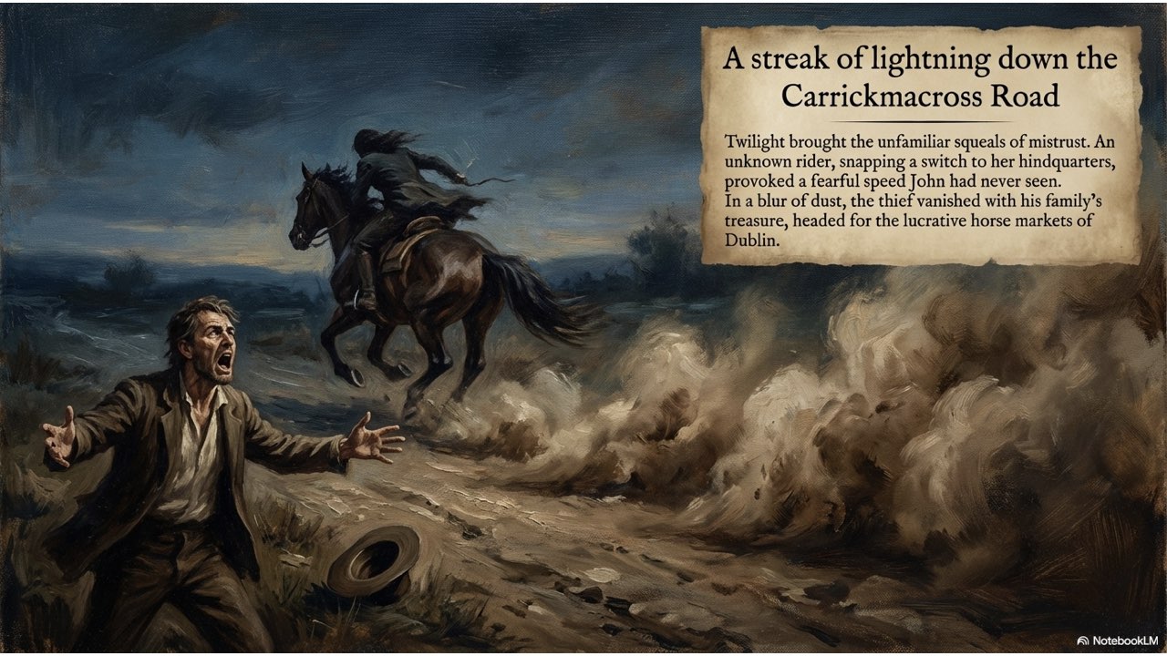 This presentation visually narrates the “Horse Thief” story, capturing the dramatic sequence of events from the initial theft at the Crievagh homestead and John’s 103km trek to the recovery of Enbarr at the River Liffey and their celebratory return home.