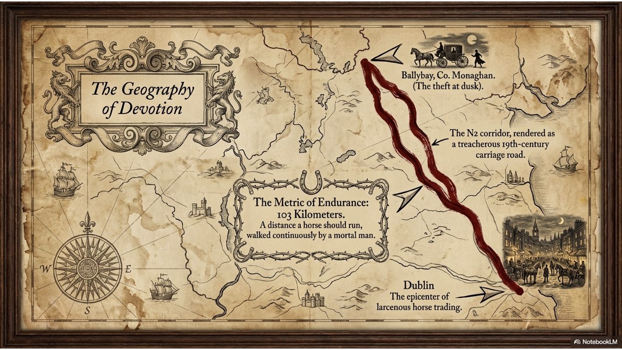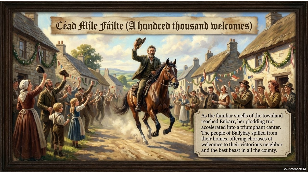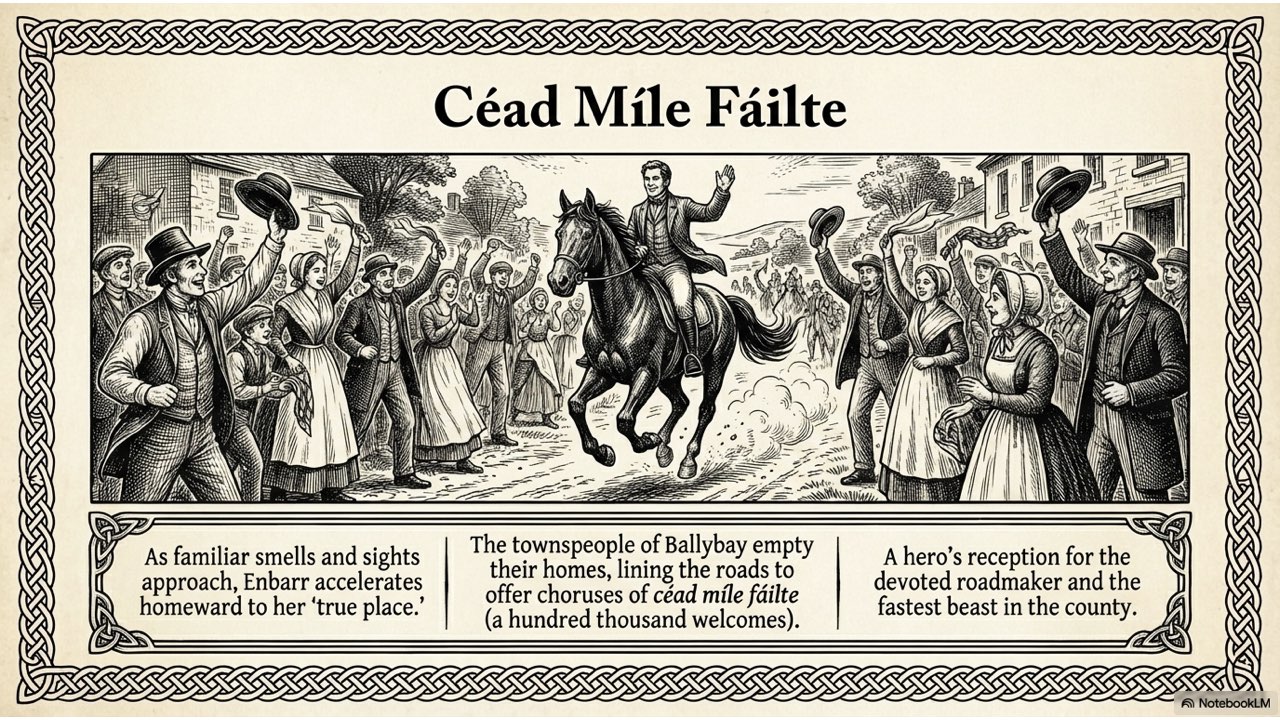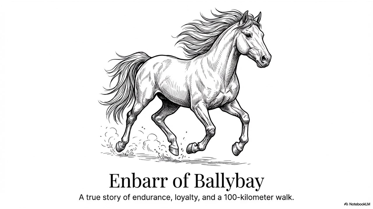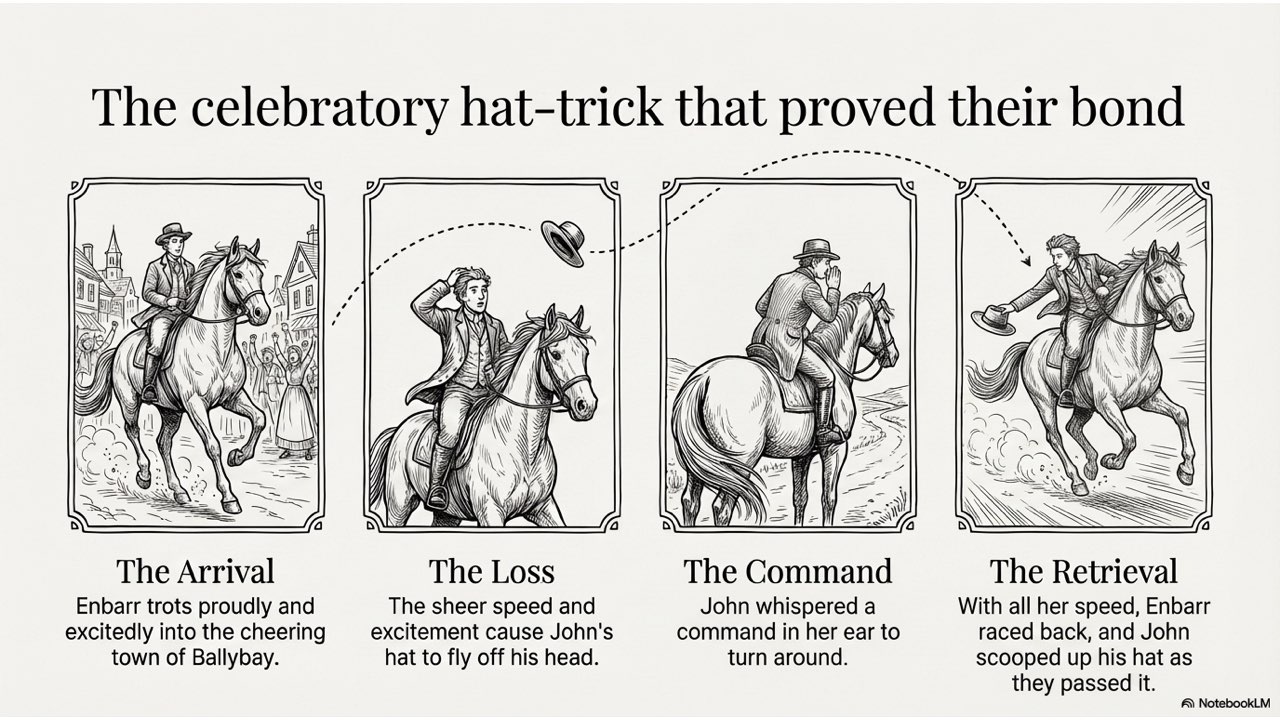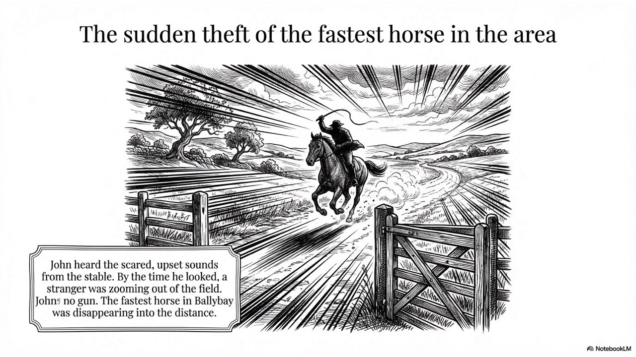 This presentation visually narrates the “Horse Thief” story, capturing the dramatic sequence of events from the initial theft at the Crievagh homestead and John’s 103km trek to the recovery of Enbarr at the River Liffey and their celebratory return home.