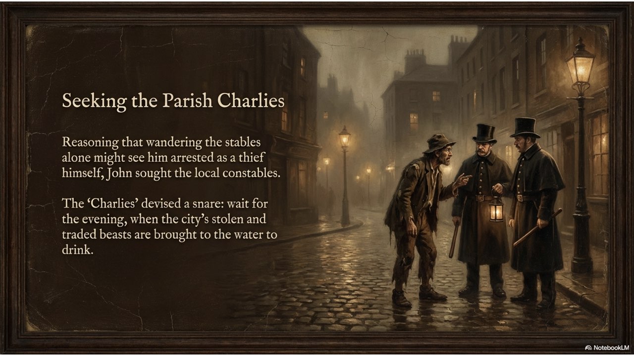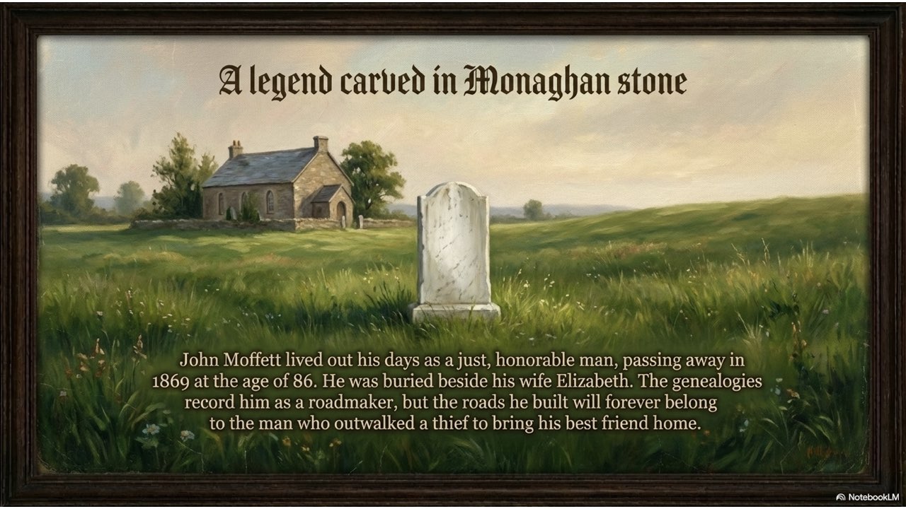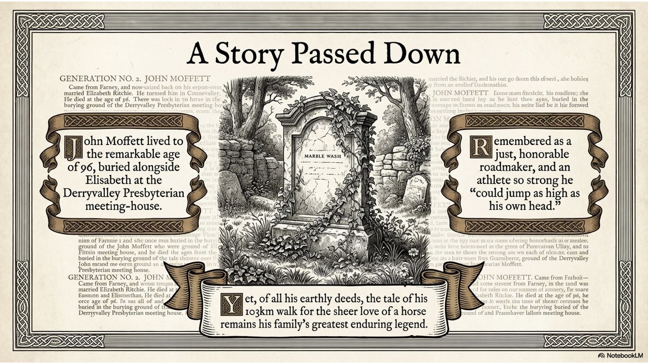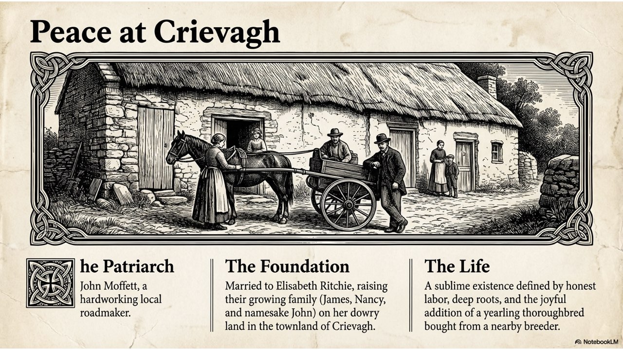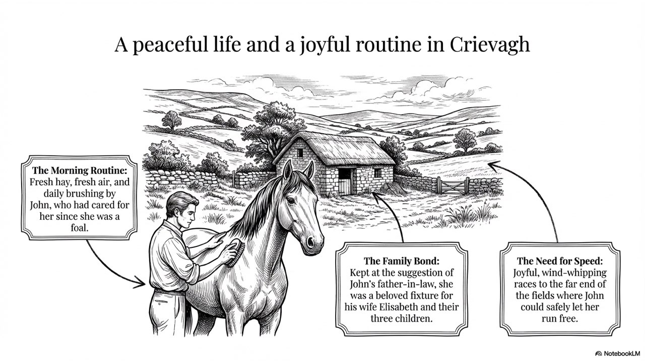 This presentation visually narrates the “Horse Thief” story, capturing the dramatic sequence of events from the initial theft at the Crievagh homestead and John’s 103km trek to the recovery of Enbarr at the River Liffey and their celebratory return home.