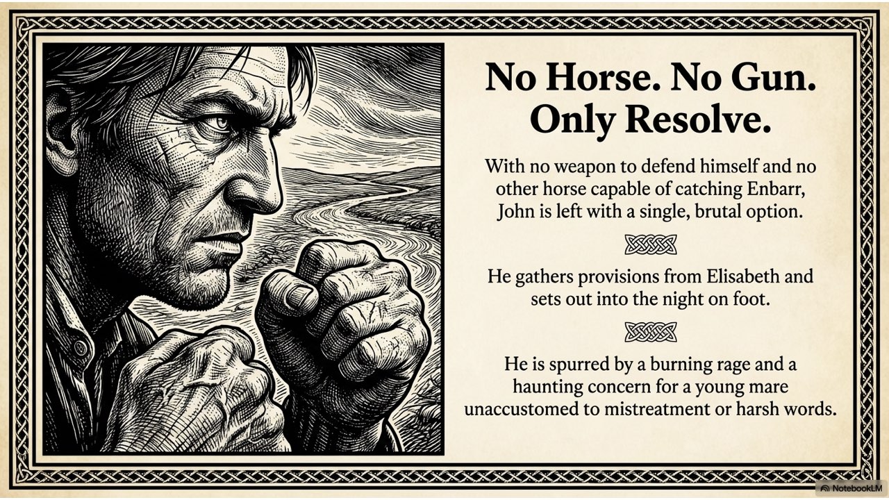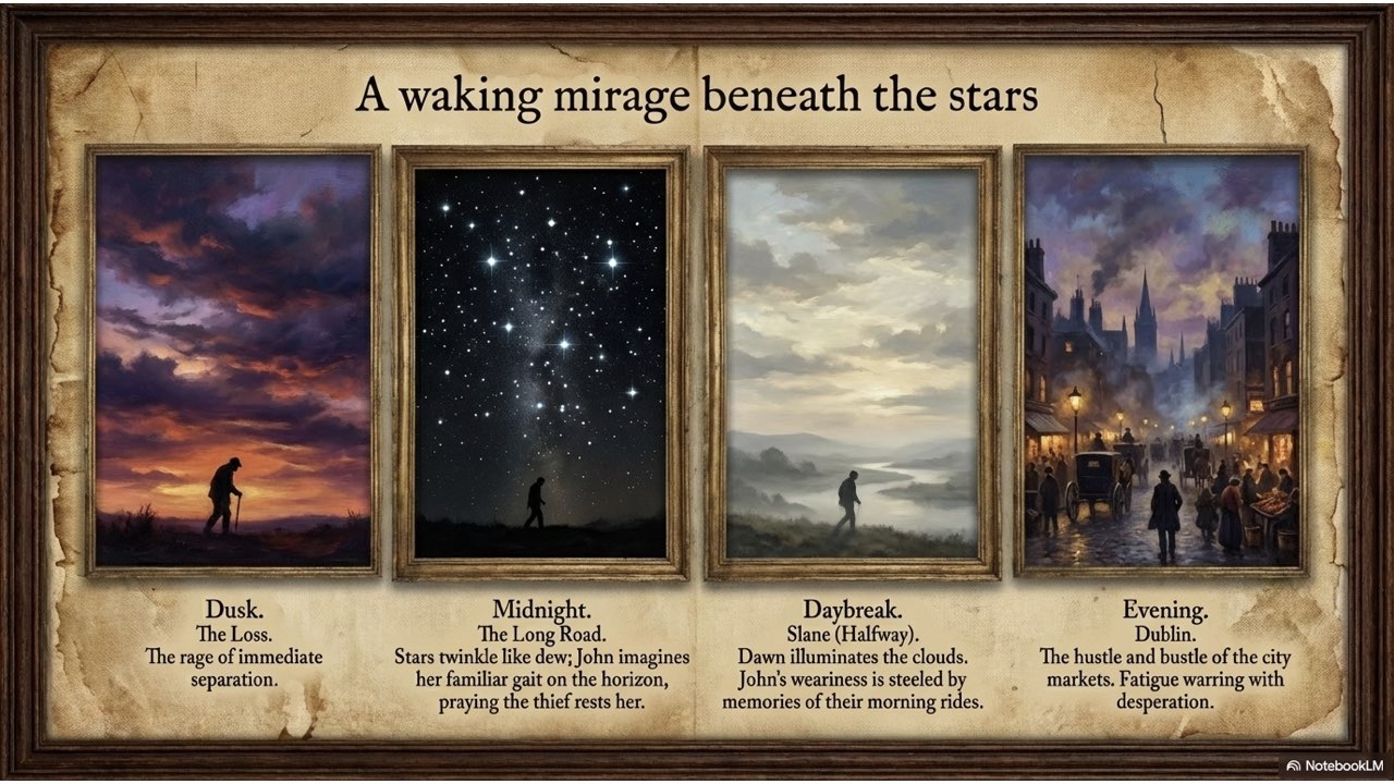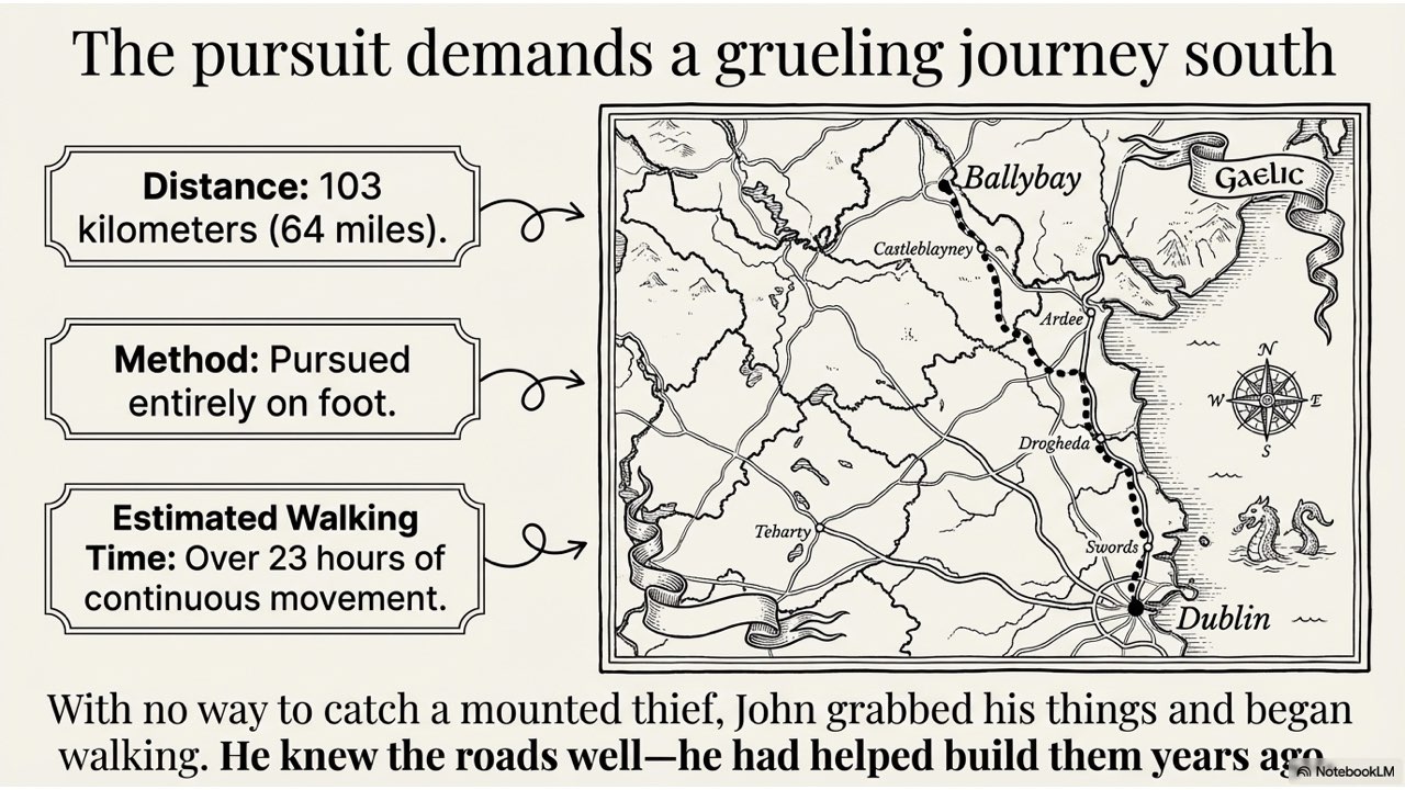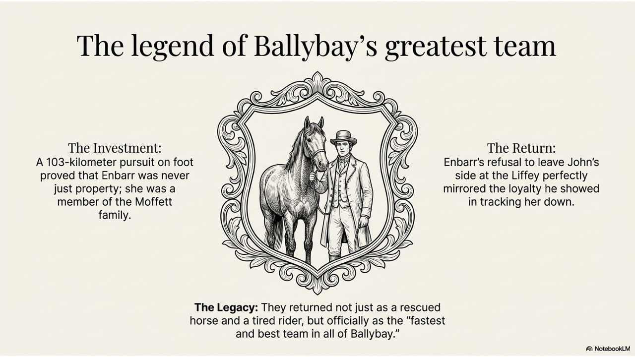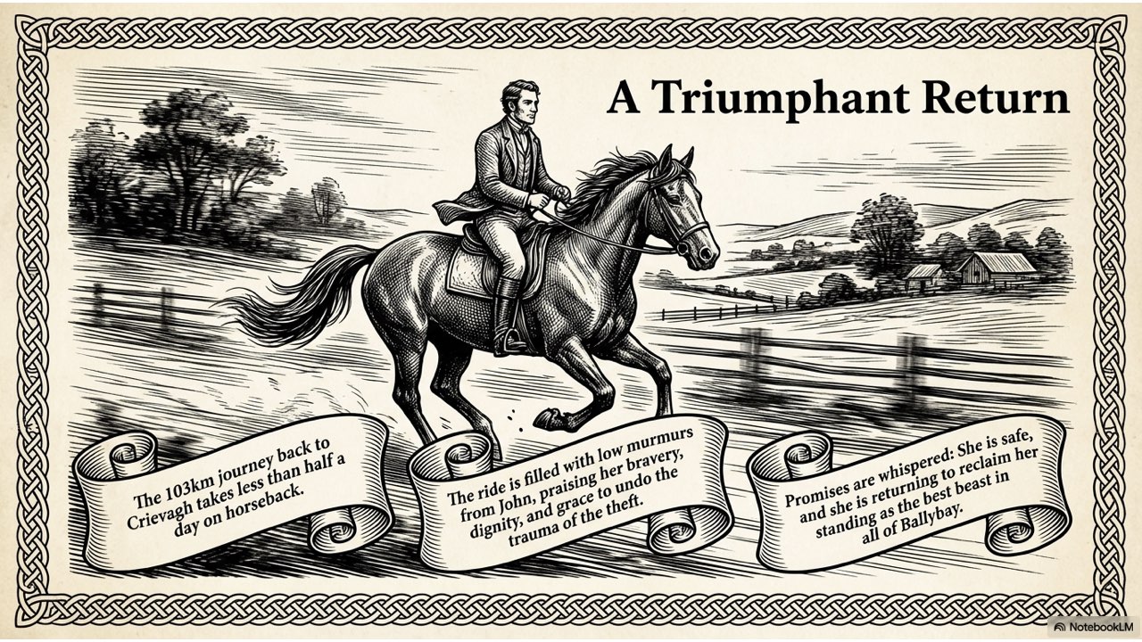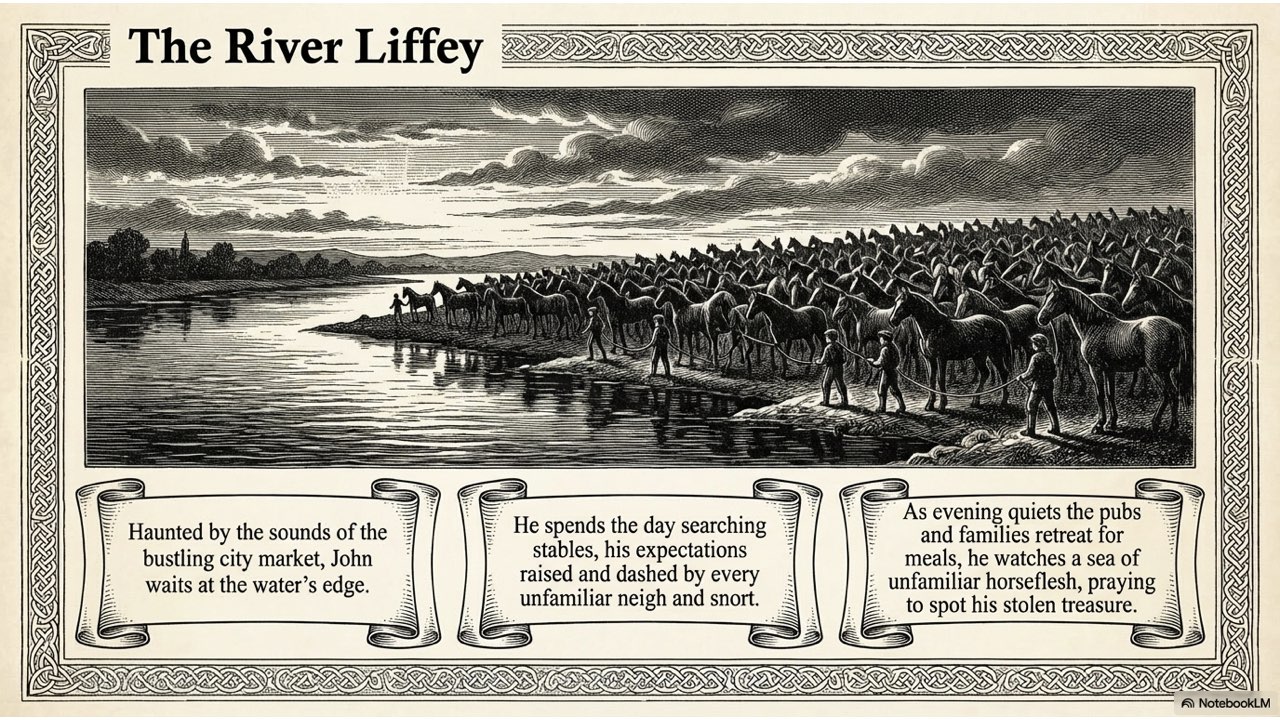 The slide deck follows the story chronologically, beginning with the peaceful life at the Crievagh homestead and moving through the theft, John’s arduous 100km journey to Dublin, the recovery of Enbarr at the River Liffey, and their celebratory return to Ballybay. The visual style is designed to match the atmospheric, historical aesthetic found in your source materials to capture the spirit of early 18th-century Ireland.