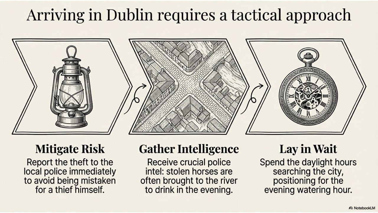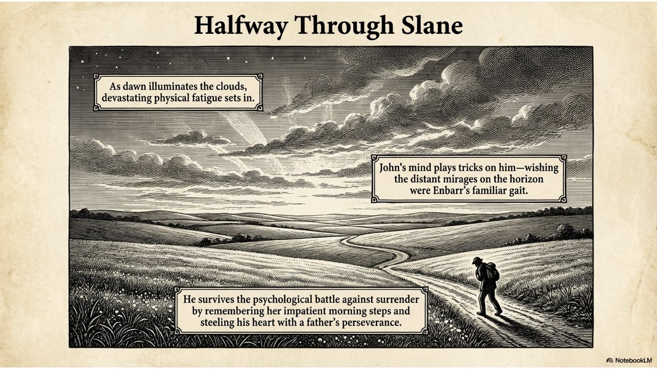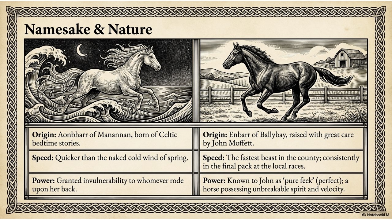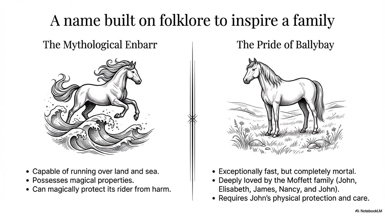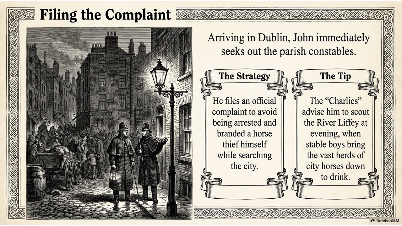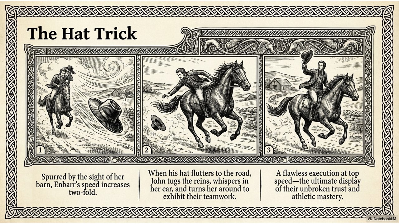 The slide deck follows the story chronologically, beginning with the peaceful life at the Crievagh homestead and moving through the theft, John’s arduous 100km journey to Dublin, the recovery of Enbarr at the River Liffey, and their celebratory return to Ballybay. The visual style is designed to match the atmospheric, historical aesthetic found in your source materials to capture the spirit of early 18th-century Ireland.