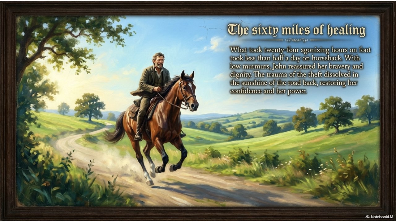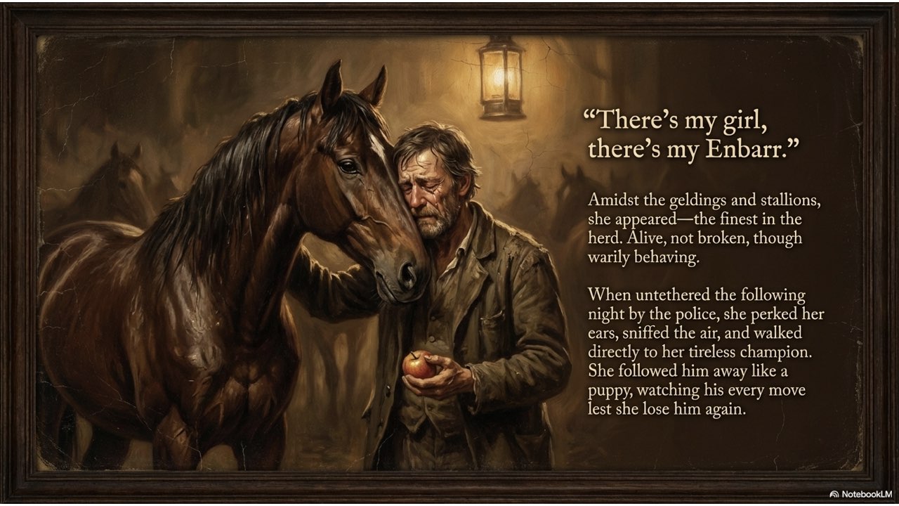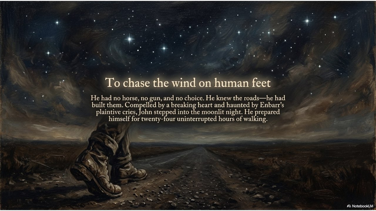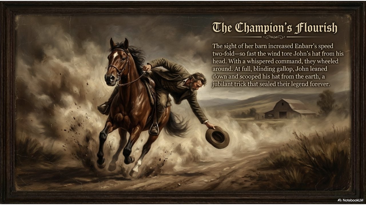 NotebookLM created a painterly-style slide deck that illustrates the dramatic narrative of John Moffett and his horse, Enbarr.