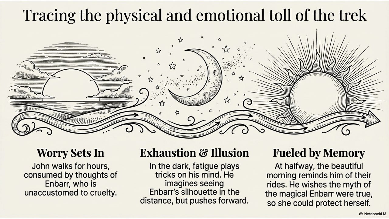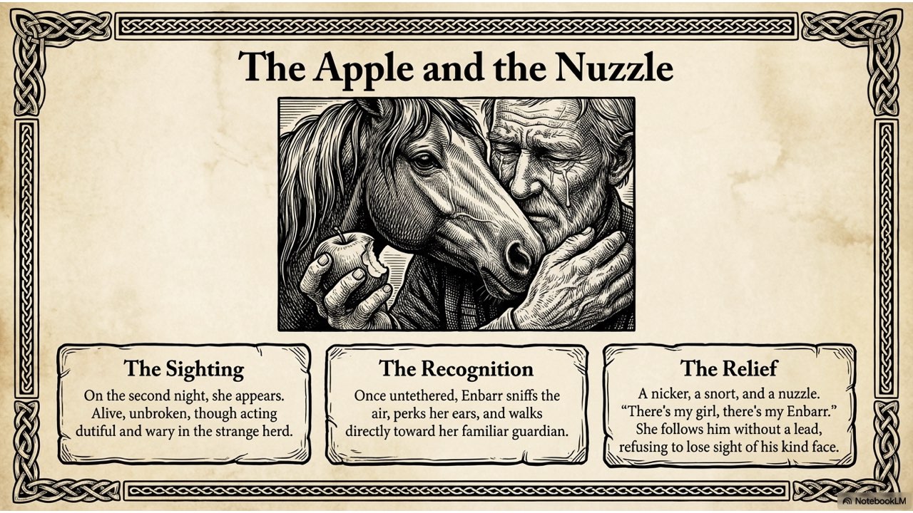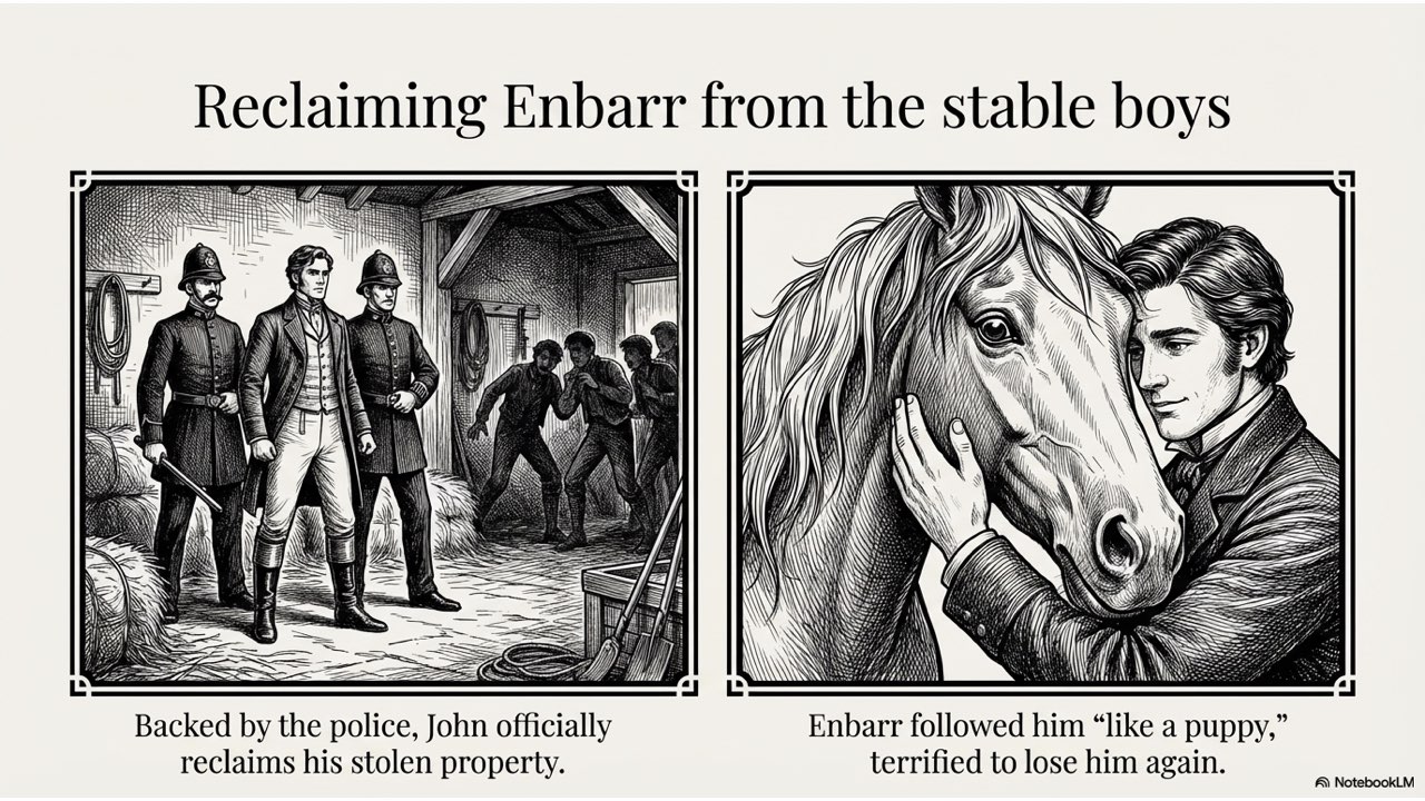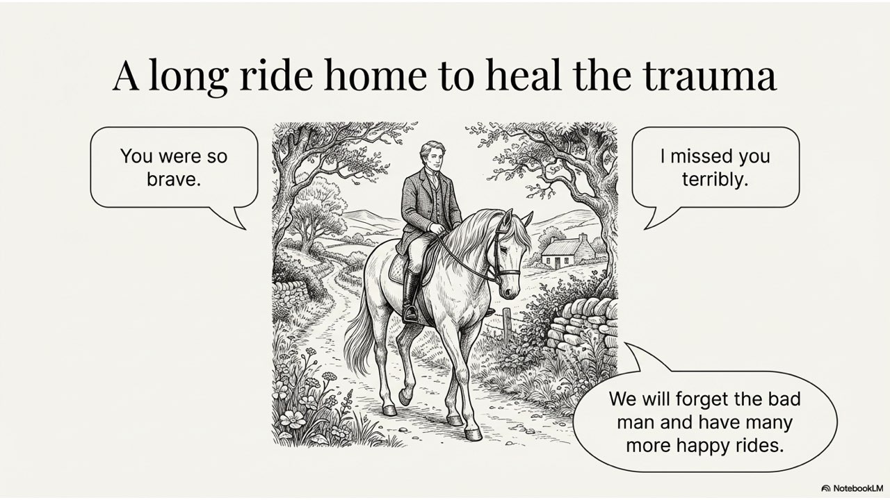 NotebookLM created a painterly-style slide deck that illustrates the dramatic narrative of John Moffett and his horse, Enbarr.